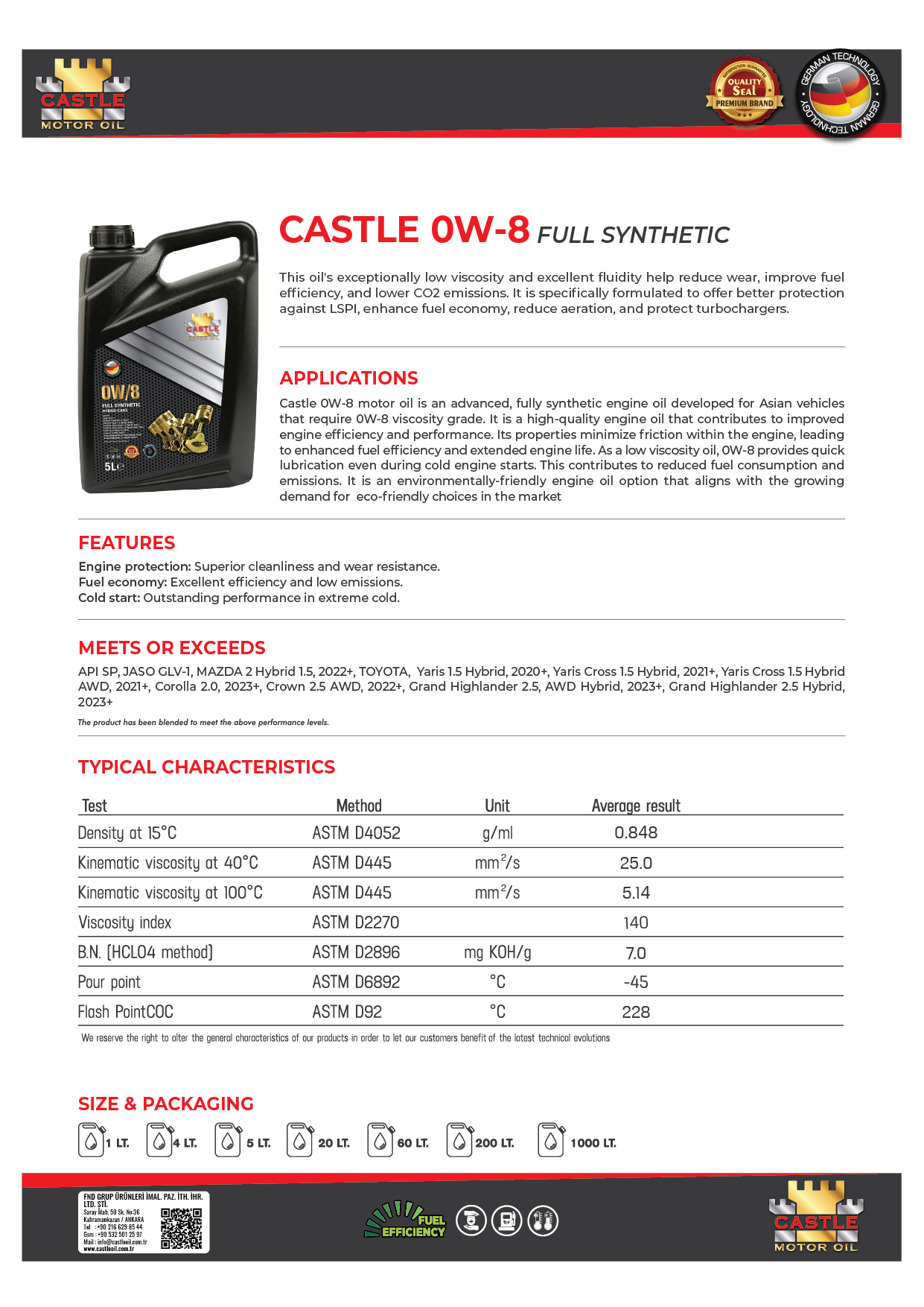 CASTLE 0W-8 FULL SYNTHETIC | 5 LT